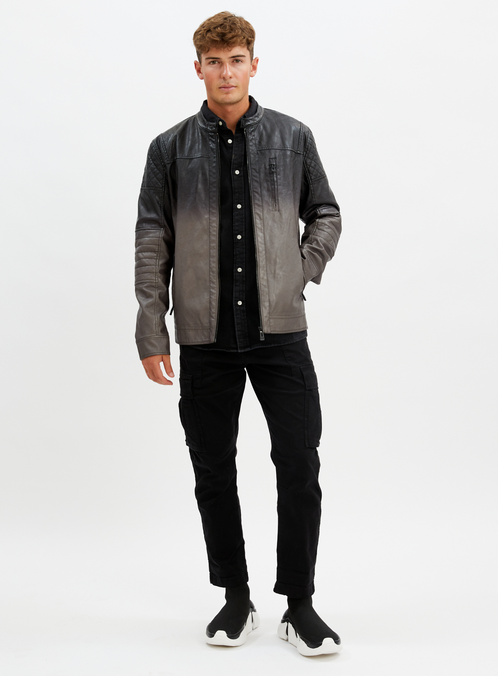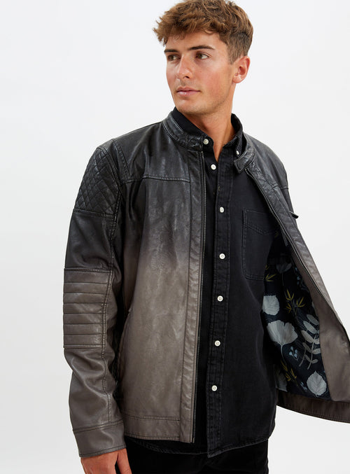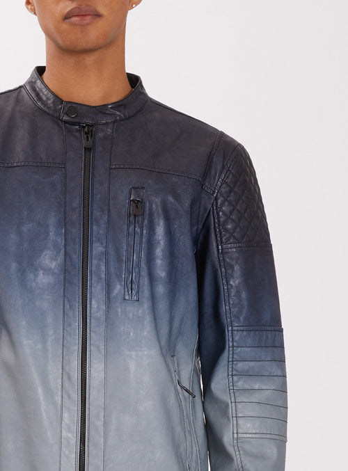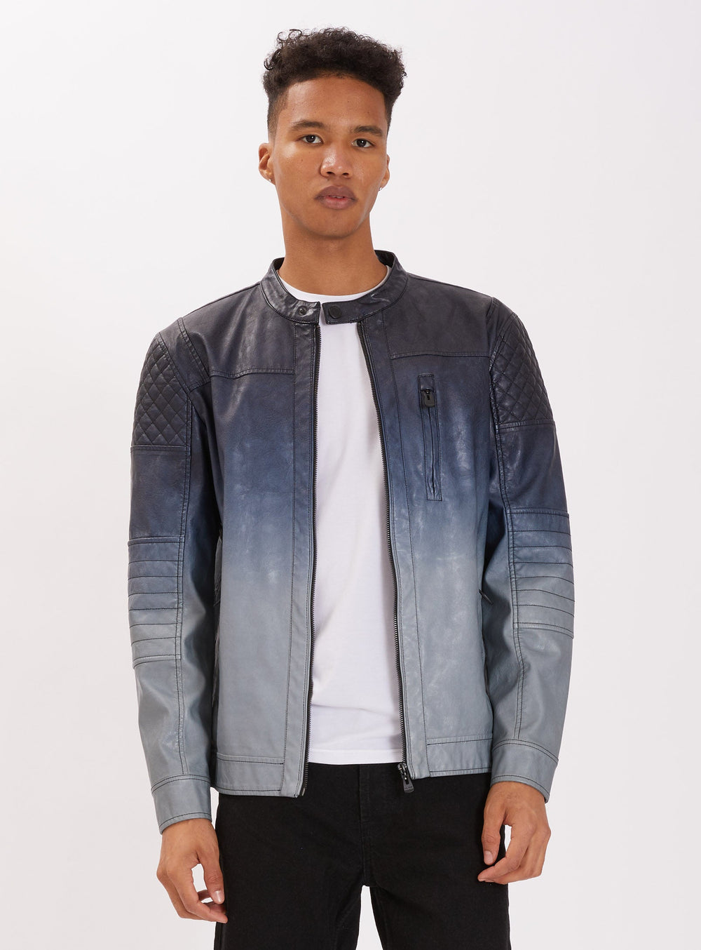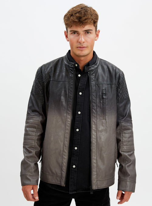 Not your usual moto vegan leather jacket. The dip dye added touch gives it a more springy and elevated look. Featuring an embossed detail on the sleeves, a front zipper closure and semi it.