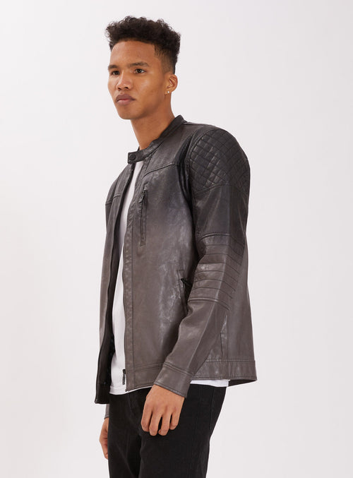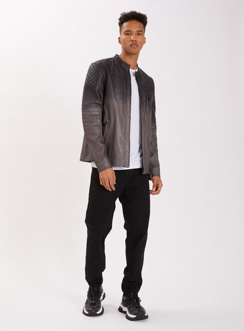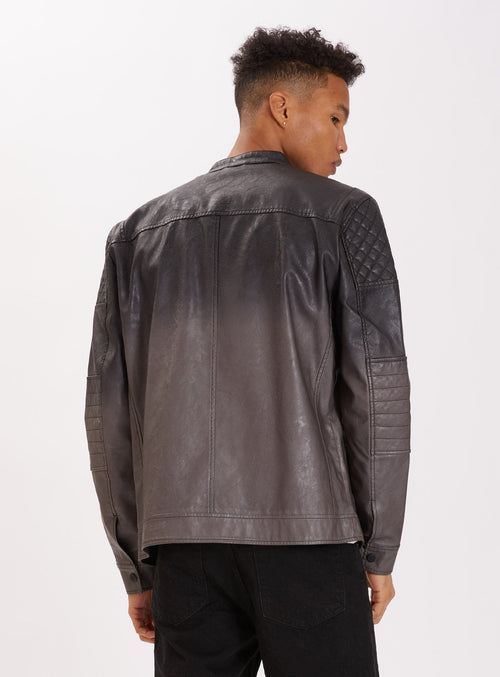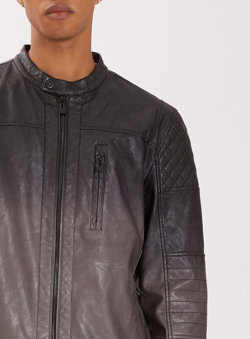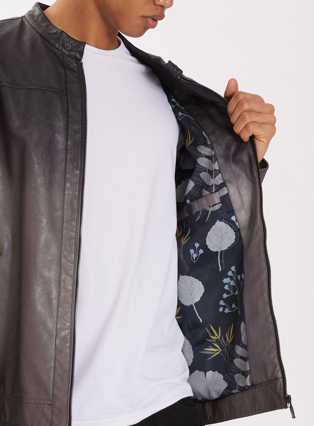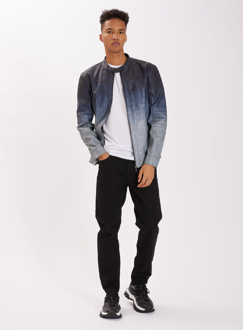 Not your usual moto vegan leather jacket. The dip dye added touch gives it a more springy and elevated look. Featuring an embossed detail on the sleeves, a front zipper closure and semi it.