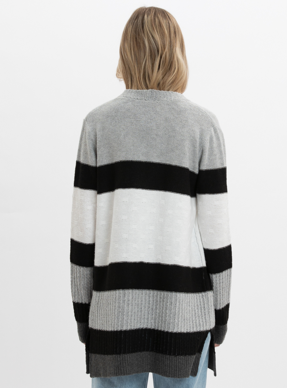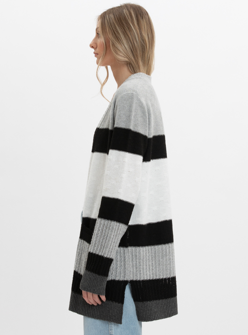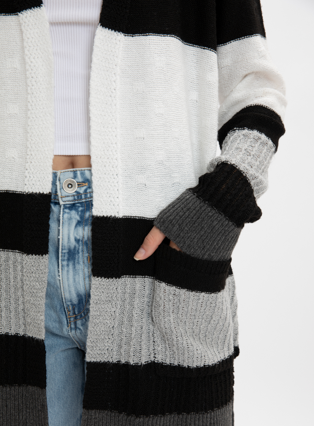 You'll be cozy and confortable in this long cardigan. It has side pockets and a striped detail.